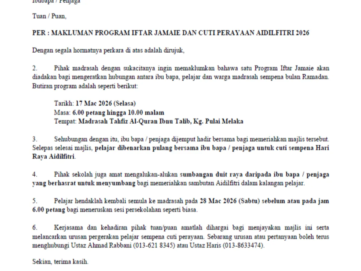Pelajar perlu kembali semula ke madrasah pada 28 Mac 2026 sebelum / pada jam 6.00 petang bagi meneruskan sesi persekolahan seperti biasa.