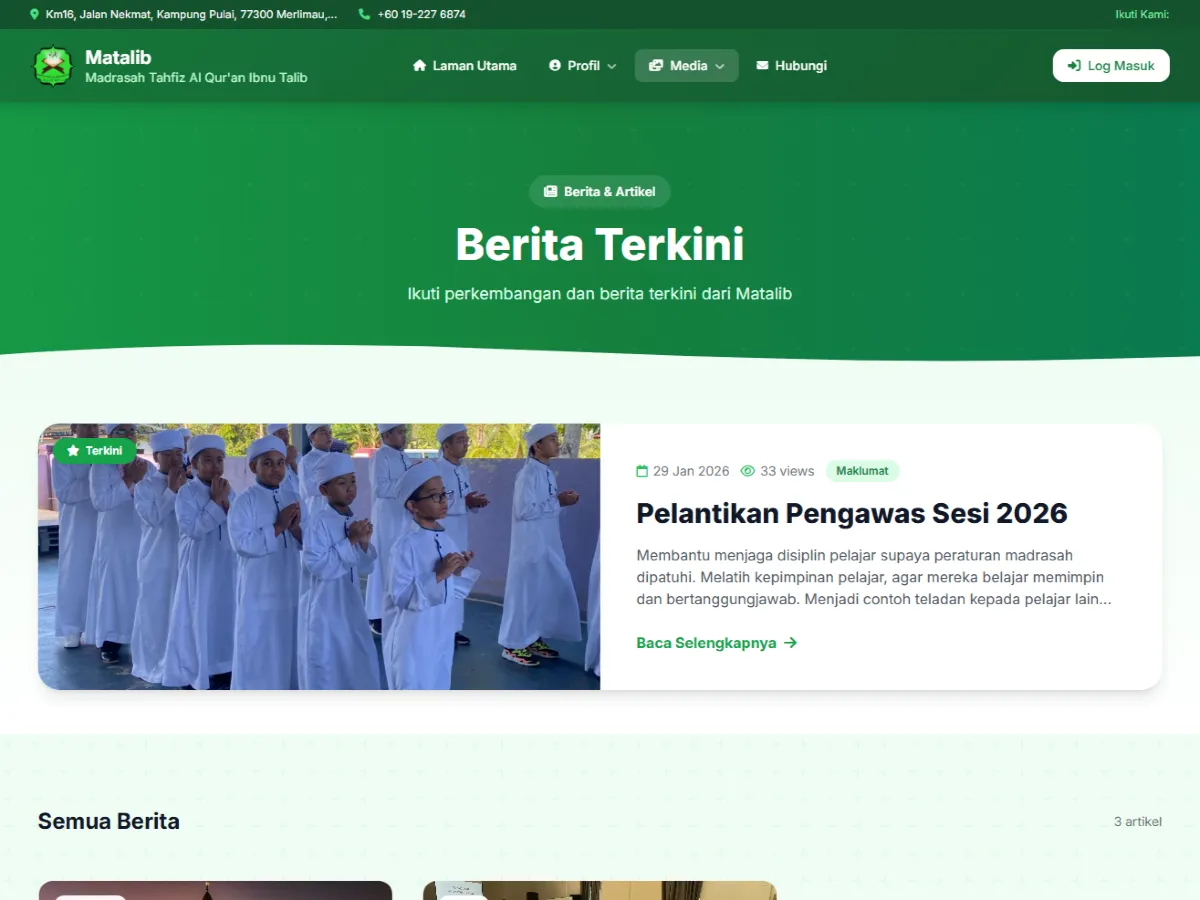Alhamdulillah, Madrasah Tahfiz Al-Qurβan Ibnu Talib kini memperkenalkan website rasmi baharu yang dibangunkan khusus bagi memperkukuh pengurusan maklumat, penyampaian dakwah, serta komunikasi antara pihak madrasah, ibu bapa, dan masyarakat umum.