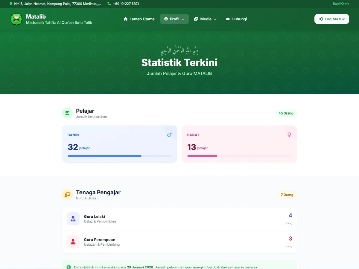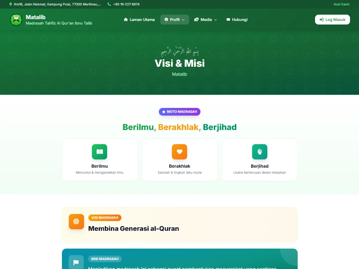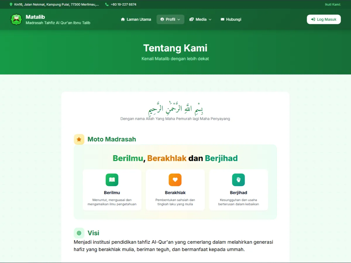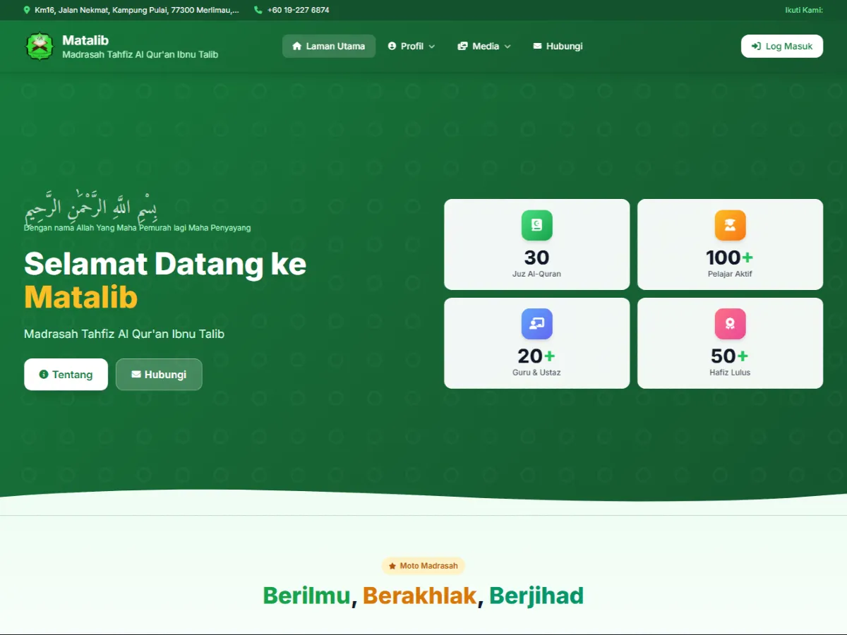Alhamdulillah, Madrasah Tahfiz Al-Qurβan Ibnu Talib kini memperkenalkan website rasmi baharu yang dibangunkan khusus bagi memperkukuh pengurusan maklumat, penyampaian dakwah, serta komunikasi antara pihak madrasah, ibu bapa, dan masyarakat umum.